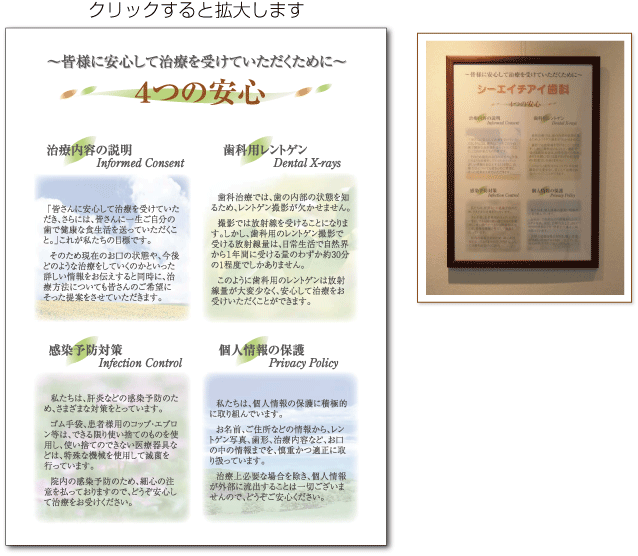 歯の治療では、外科と同じように出血を伴うことがあります。そのため、院内の感染予防には万全の対策をする必要があります。そのほか、レントゲンによる放射線への不安、皆さんの個人情報の管理、治療に関する説明の徹底など、皆さんに安心して治療を受けていただくためには、さまざまな対策やルールが必要になります。
